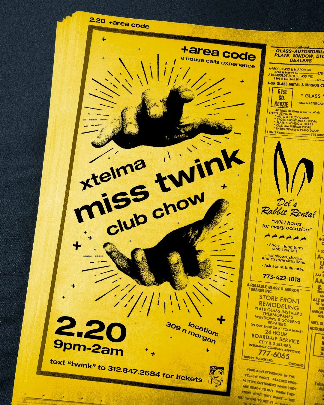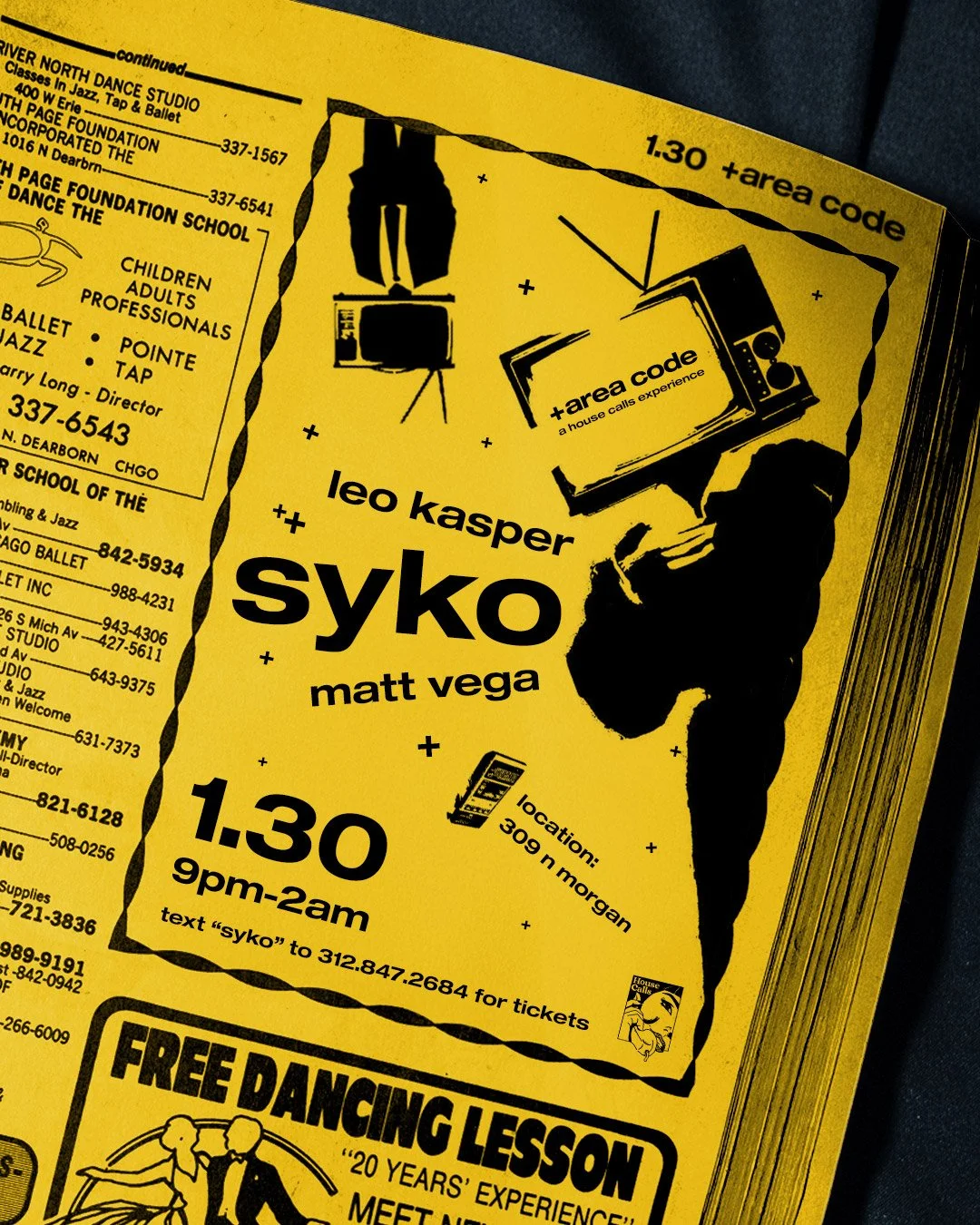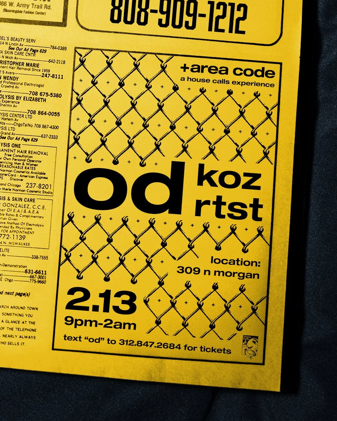 +area code is a timeline within the House Calls universe that reflects 90s and Y2K aesthetics with an emphasis on rave culture, escapism, urban travel. and exploration. This boom of technology made us feel digitally connected but often socially empty. With technology and surveillance encroaching, we had to start speaking in code, gathering in unconventional spaces, and liberation ourselves from phones. Locations will be kept secret from all non-ticket holders, urging people to find the code and tap into our hotline.